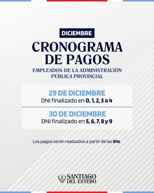 El Ministerio de Economía informa que el próximo Lunes 29 y Martes 30, a partir de las 8 horas, se hará efectivo el pago de haberes correspondientes a Diciembre a todos los agentes de la administración pública provincial.