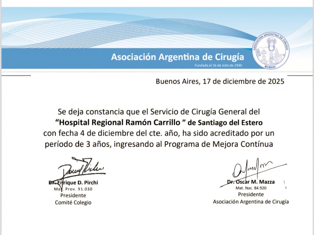 Los Servicios de Cirugía General y de Cirugía de Urgencia del Hospital Regional Dr. Ramón Carrillo fueron acreditados por la Asociación Argentina de Cirugía (AAC) por un período de tres años, e incorporados al Programa de Gestión de Mejora Continua, un reconocimiento de alcance nacional que avala la calidad asistencial, la seguridad de la atención y el nivel de complejidad del servicio.
