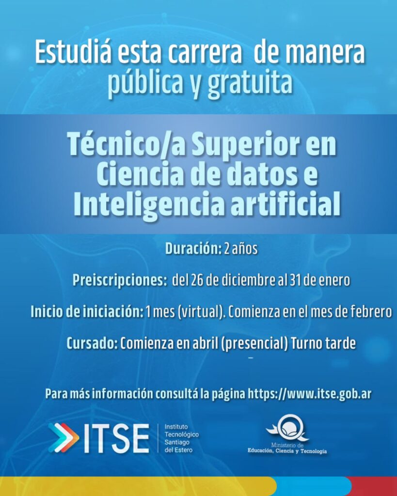El Instituto Tecnológico de Santiago del Estero, dependiente del Ministerio de Educación, Ciencia y Tecnología de la provincia, abrió su oferta educativa para el Ciclo Lectivo 2026 para todos los interesados en cursar las tecnicaturas superiores en Desarrollo de Software; en Ciencia de Datos e Inteligencia Artificial y en Biotecnología.