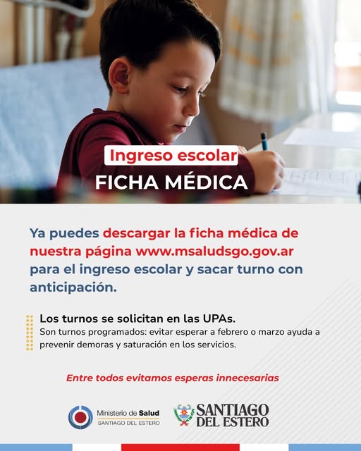 El Ministerio de Salud de la Provincia informa que ya se encuentra disponible la ficha médica obligatoria para el ingreso escolar, requisito necesario para niños y niñas que inician el ciclo lectivo.