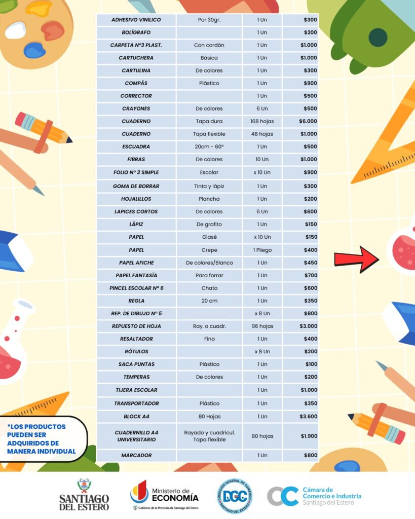 El Gobierno de la provincia, a través del Ministerio de Economía, dio a conocer el Listado de Precios Escolares Santiagueños Sugeridos, compuesto por que estarán disponibles desde este martes 10 de febrero hasta el 31 de marzo en librerías adheridas de ciudad Capital, La Banda, Frías, Termas de Río Hondo, Monte Quemado y Fernández.