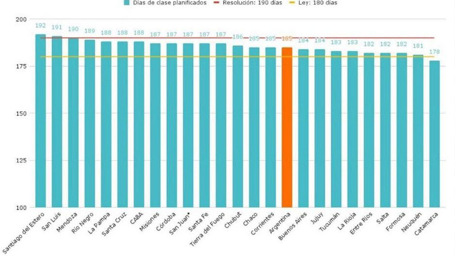 El informe reveló que solo tres provincias planificaron el ciclo lectivo con la cantidad de días exigida por el Consejo Federal de Educación (CFE): Santiago del Estero (192 días), San Luis (191 días) y Mendoza (190 días), superando el mínimo de 190 días de clases acordado.
