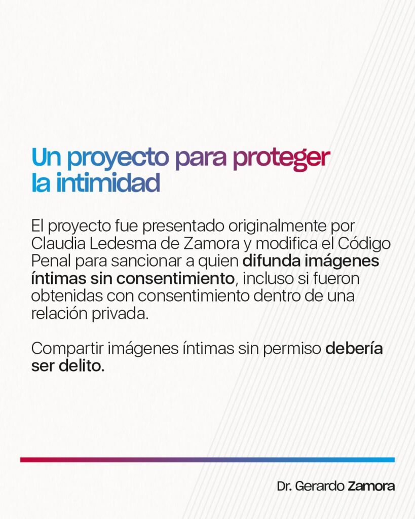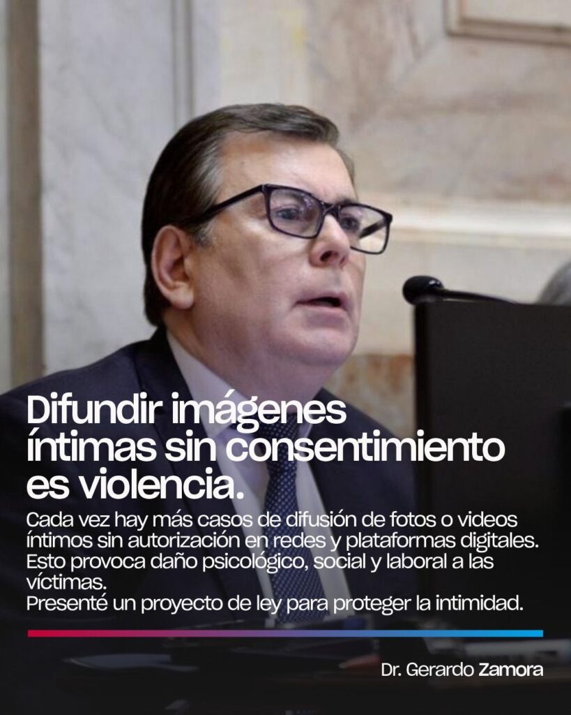 Tal como lo había adelantado, el senador Gerardo Zamora presentó este jueves 9 de abril, en el Congreso de la nación el tratamiento de un proyecto de ley que busca incorporar al Código Penal sanciones específicas para la difusión no consentida de imágenes o contenidos íntimos, una práctica conocida como “pornovenganza” o violencia digital.